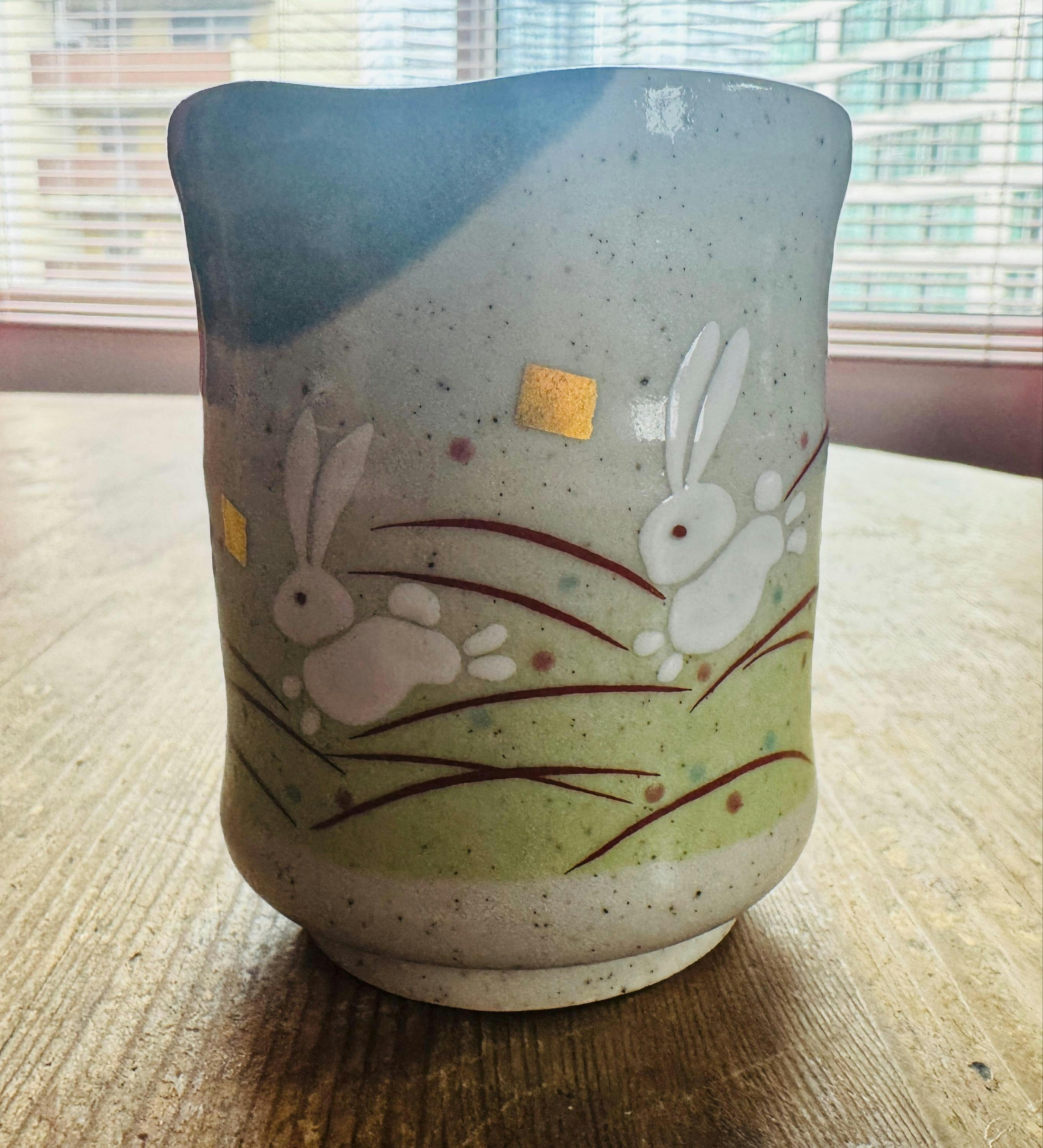 Hana Usagi Rabbit Gray Kutani-yaki Yunomi - Japanese Teacup